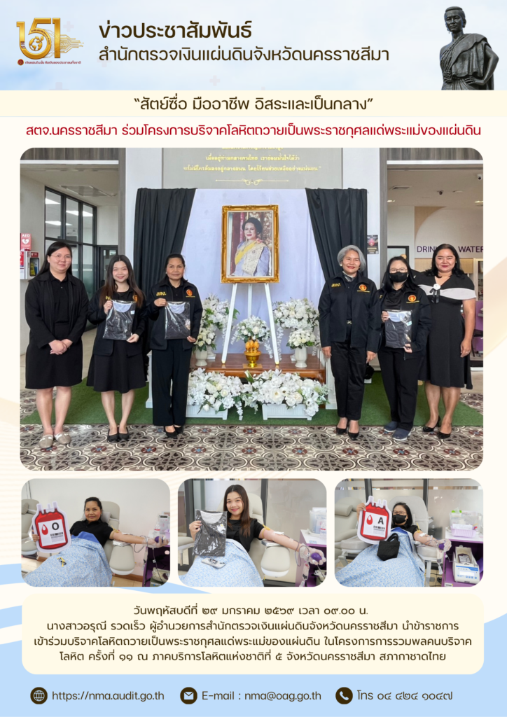 วันพฤหัสบดีที่ ๒๙ มกราคม ๒๕๖๙ เวลา ๐๙.๐๐ น. นางสาวอรุณี รวดเร็ว ผู้อำนวยการสำนักตรวจเงินแผ่นดินจังหวัดนครราชสีมา นำข้าราชการ เข้าร่วมบริจาคโลหิตถวายเป็นพระราชกุศลแด่พระแม่ของแผ่นดิน ในโครงการการรวมพลคนบริจาคโลหิต ครั้งที่ ๑๑ ณ ภาคบริการโลหิตแห่งชาติที่ ๕ จังหวัดนครราชสีมา สภากาชาดไทย