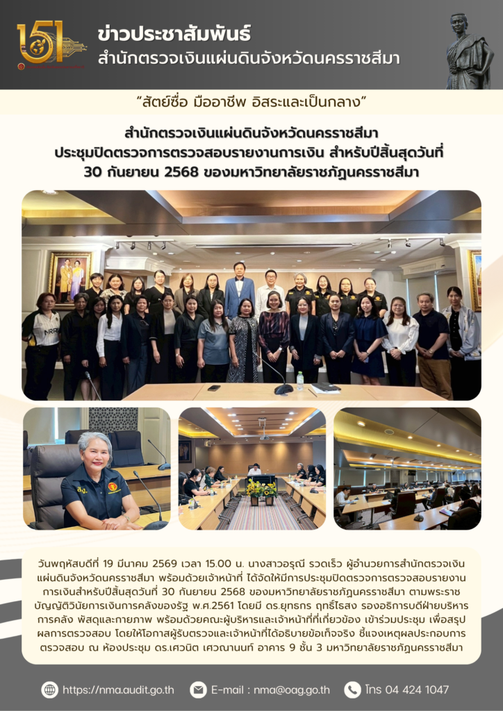 วันพฤหัสบดีที่ 19 มีนาคม 2569 เวลา 15.00 น. นางสาวอรุณี รวดเร็ว ผู้อำนวยการสำนักตรวจเงินแผ่นดินจังหวัดนครราชสีมา พร้อมด้วยเจ้าหน้าที่ ได้จัดให้มีการประชุมปิดตรวจการตรวจสอบรายงานการเงินสำหรับปีสิ้นสุดวันที่ 30 กันยายน 2568 ของมหาวิทยาลัยราชภัฏนครราชสีมา ตามพระราชบัญญัติวินัยการเงินการคลังของรัฐ พ.ศ.2561 โดยมี ดร.ยุทธกร ฤทธิ์ไธสง รองอธิการบดีฝ่ายบริหารการคลัง พัสดุและกายภาพ พร้อมด้วยคณะผู้บริหารและเจ้าหน้าที่ที่เกี่ยวข้อง เข้าร่วมประชุม เพื่อสรุปผลการตรวจสอบ โดยให้โอกาสผู้รับตรวจและเจ้าหน้าที่ได้อธิบายข้อเท็จจริง ชี้แจงเหตุผลประกอบการตรวจสอบ ณ ห้องประชุม ดร.เศวนิต เศวณานนท์ อาคาร 9 ชั้น 3 มหาวิทยาลัยราชภัฏนครราชสีมา