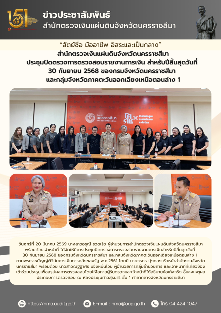 ชวันศุกร์ที่ 20 มีนาคม 2569 นางสาวอรุณี รวดเร็ว ผู้อำนวยการสำนักตรวจเงินแผ่นดินจังหวัดนครราชสีมา พร้อมด้วยเจ้าหน้าที่ได้จัดให้มีการประชุมปิดตรวจการตรวจสอบรายงานการเงินสำหรับปีสิ้นสุดวันที่ 30กันยายน 2568 ของกรมจังหวัดนครราชสีมา และกลุ่มจังหวัดภาคตะวันออกเฉียงเหนือตอนล่าง 1 ตามพระราชบัญญัติวินัยการเงินการคลังของรัฐ พ.ศ.2561 โดยมี นายวรกร บุ้งทอง หัวหน้าสำนักงานจังหวัดนครราชสีมา พร้อมด้วย นาวสาวณัฐฐาศิริ แจ้งหมื่นไวย ผู้อำนวยการกลุ่มอำนวยการ และเจ้าหน้าที่ที่เกี่ยวข้อง เข้าร่วมประชุมเพื่อสรุปผลการตรวจสอบโดยให้โอกาสผู้รับตรวจและเจ้าหน้าที่ได้อธิบาย ข้อเท็จจริง ชี้แจงเหตุผลประกอบการตรวจสอบ ณ ห้องประชุมท้าวสุรนารี ชั้น 1 ศาลากลางจังหวัดนครราชสีมา