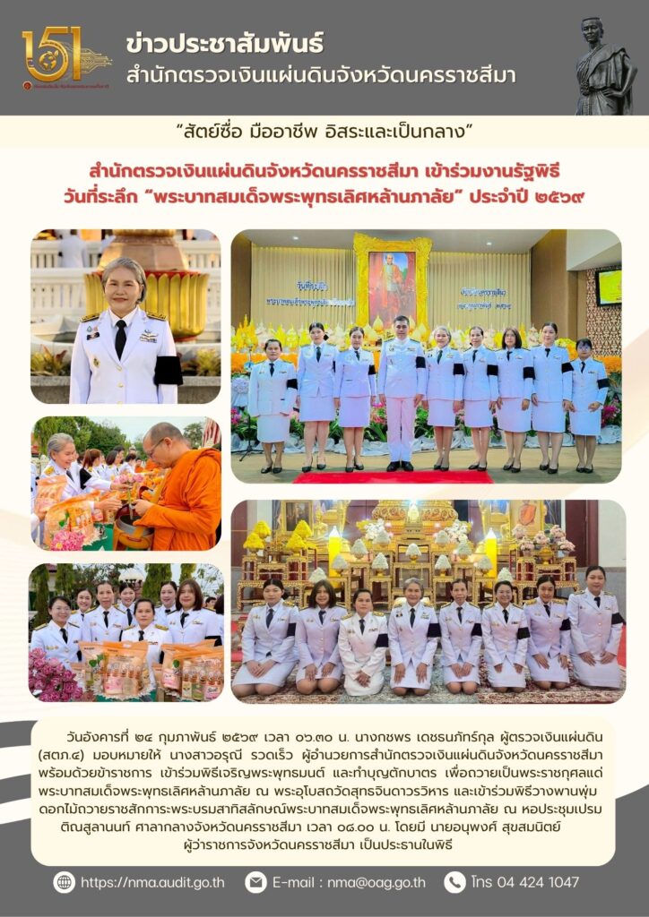 วันอังคารที่ ๒๔ กุมภาพันธ์ ๒๕๖๙ เวลา ๐๖.๓๐ น. นางกชพร เดชธนภัทร์กุล ผู้ตรวจเงินแผ่นดิน (สตภ.๔) มอบหมายให้ นางสาวอรุณี รวดเร็ว ผู้อำนวยการสำนักตรวจเงินแผ่นดินจังหวัดนครราชสีมา พร้อมด้วยข้าราชการ เข้าร่วมพิธีเจริญพระพุทธมนต์ และทำบุญตักบาตร เพื่อถวายเป็นพระราชกุศลแด่พระบาทสมเด็จพระพุทธเลิศหล้านภาลัย ณ พระอุโบสถวัดสุทธจินดาวรวิหาร และเข้าร่วมพิธีวางพานพุ่มดอกไม้ ถวายราชสักการะพระบรมสาทิสลักษณ์พระบาทสมเด็จพระพุทธเลิศหล้านภาลัย ณ หอประชุมเปรมติณสูลานนท์ ศาลากลางจังหวัดนครราชสีมา เวลา ๐๘.๐๐ น. โดยมี นายอนุพงศ์ สุขสมนิตย์ ผู้ว่าราชการจังหวัดนครราชสีมา เป็นประธานในพิธี