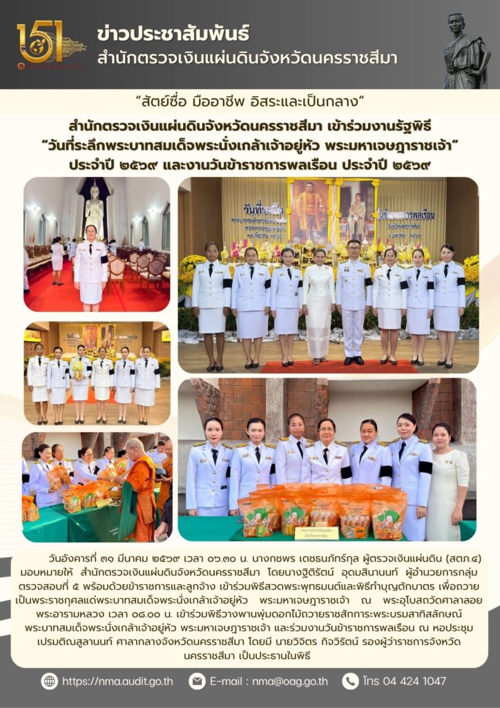 วันอังคารที่ ๓๑ มีนาคม ๒๕๖๙ เวลา ๐๖.๓๐ น. นางกชพร เดชธนภัทร์กุล ผู้ตรวจเงินแผ่นดิน (สตภ.๔) มอบหมายให้ สำนักตรวจเงินแผ่นดินจังหวัดนครราชสีมา โดยนางฐิติรัตน์ อุดมสินานนท์ ผู้อำนวยการกลุ่มตรวจสอบที่ ๕ พร้อมด้วยข้าราชการและลูกจ้าง เข้าร่วมพิธีสวดพระพุทธมนต์และพิธีทำบุญตักบาตร เพื่อถวายเป็นพระราชกุศลแด่พระบาทสมเด็จพระนั่งเกล้าเจ้าอยู่หัว พระมหาเจษฎาราชเจ้า ณ พระอุโบสถวัดศาลาลอย พระอารามหลวง เวลา ๐๘.๐๐ น. เข้าร่วมพิธีวางพานพุ่มดอกไม้ถวายราชสักการะพระบรมสาทิสลักษณ์ พระบาทสมเด็จพระนั่งเกล้าเจ้าอยู่หัว พระมหาเจษฎาราชเจ้า และร่วมงานวันข้าราชการพลเรือน ณ หอประชุมเปรมติณสูลานนท์ ศาลากลางจังหวัดนครราชสีมา โดยมี นายวิจิตร กิจวิรัตน์ รองผู้ว่าราชการจังหวัดนครราชสีมา เป็นประธานในพิธี