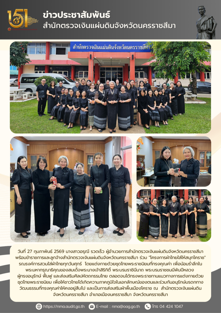 วันที่ 27 กุมภาพันธ์ 2569 นางสาวอรุณี รวดเร็ว ผู้อำนวยการสำนักตรวจเงินแผ่นดินจังหวัดนครราชสีมา พร้อมข้าราชการและลูกจ้างสำนักตรวจเงินแผ่นดินจังหวัดนครราชสีมา ร่วม “โครงการผ้าไทยใส่ให้สนุกโคราช” รณรงค์การสวมใส่ผ้าไทยทุกวันศุกร์ โดยร่วมแต่งกายด้วยชุดไทยพระราชนิยมที่ทรงคุณค่า เพื่อน้อมรำลึกในพระมหากรุณาธิคุณของสมเด็จพระนางเจ้าสิริกิติ์ พระบรมราชินีนาถ พระบรมราชชนนีพันปีหลวง ผู้ทรงอนุรักษ์ ฟื้นฟู และส่งเสริมศิลปหัตถกรรมไทย ตลอดจนได้ทรงพระราชทานแนวทางการแต่งกายด้วยชุดไทยพระราชนิยม เพื่อให้ชาวไทยได้เกิดความภาคภูมิใจในเอกลักษณ์ของตนและร่วมกันอนุรักษ์มรดกทางวัฒนธรรมที่ทรงคุณค่าให้คงอยู่สืบไป และเป็นการส่งเสริมผ้าพื้นเมืองโคราช ณ สำนักตรวจเงินแผ่นดินจังหวัดนครราชสีมา อำเภอเมืองนครราชสีมา จังหวัดนครราชสีมา